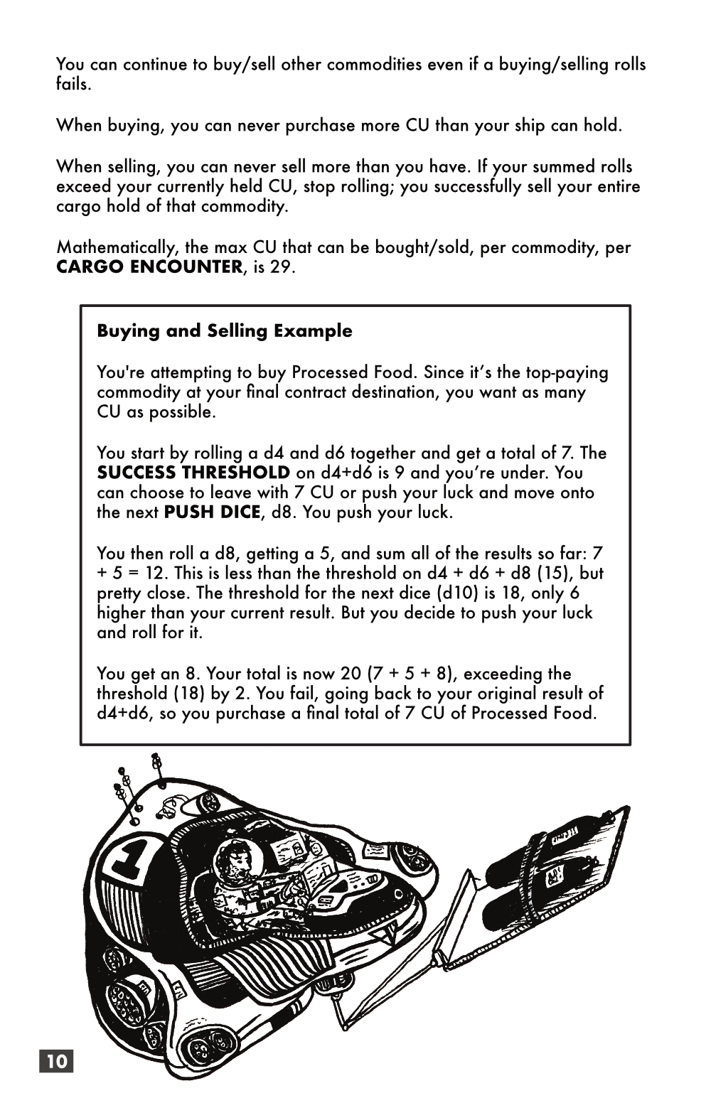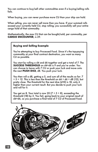 - Push-your-luck system for buying and selling goods, using d4 through d20